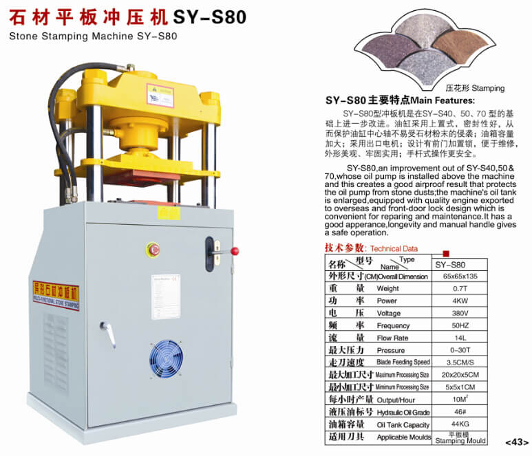 Это Машина для раскалывания камня используется для резки брусчатки различных размеров на куски. Машина может выполнять как камень штамповка и расщепление. Он работает с низким энергопотреблением и высокой эффективностью, прост в эксплуатации и имеет высокую производительность. Китай каменная машина является профессиональным поставщиком штамповка камня & разделительная машина с быстрым временем доставки и низкой ценой.